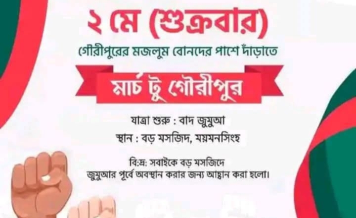 ওইসব বখাটেদের দৃষ্টান্তমূলক শাস্তির দাবিতে আজ বাদ জুমুআ ময়মনসিংহ বড় মসজিদ থেকে মার্চ টু গৌরিপুর কর্মসুচির আয়োজন করা হয়েছে।