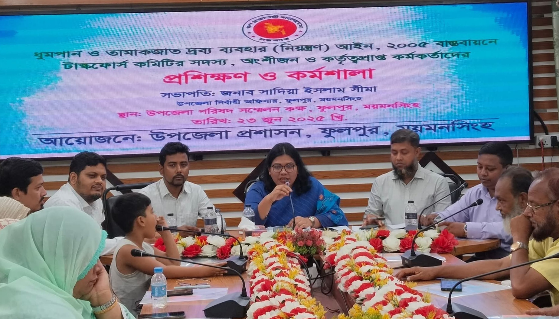 ময়মনসিংহের ফুলপুর উপজেলা নির্বাহী অফিসার (ইউএনও) সাদিয়া ইসলাম সীমা বলেছেন, ''বিশেষ করে শিক্ষক, সাংবাদিক ও জনপ্রতিনিধিদের ধূমপানকে সরাসরি 'না' বলতে হবে।'' আজ সোমবার (২৩ জুন) সকাল ১১টার দিকে ধূমপান ও তামাকজাত দ্রব্য ব্যবহার নিয়ন্ত্রণ কার্যক্রমের আওতায় উপজেলা পর্যায়ে তামাক বিরোধী এক প্রশিক্ষণ কর্মশালায় সভাপতির বক্তব্যে তিনি একথা বলেন। তিনি বলেন, তামাক ও ধূমপানের কুফল থেকে সমাজ ও দেশকে রক্ষা করতে হলে তামাকদ্রব্য সেবন থেকে সবাইকে বিরত থাকতে হবে। এ সময় আরও বক্তব্য রাখেন ও উপস্থিত ছিলেন, সহকারী কমিশনার (ভূমি) মেহেদী হাসান ফারুক, উপজেলা কৃষি অফিসার ফারুক আহম্মেদ, ফুলপুর থানার অফিসার ইনচার্জ (ওসি) মোঃ আব্দুল হাদি, উপজেলা প্রাণি সম্পদ কর্মকর্তা তারেক আহমেদ, উপজেলা সমাজসেবা অফিসার শিহাব উদ্দিন খান, সাংবাদিক হুমায়ুন কবীর মুকুল, নুরুল আমিন প্রমুখ। কর্মশালায় ৩৫ জন প্রশিক্ষণার্থী উপস্থিত ছিলেন।