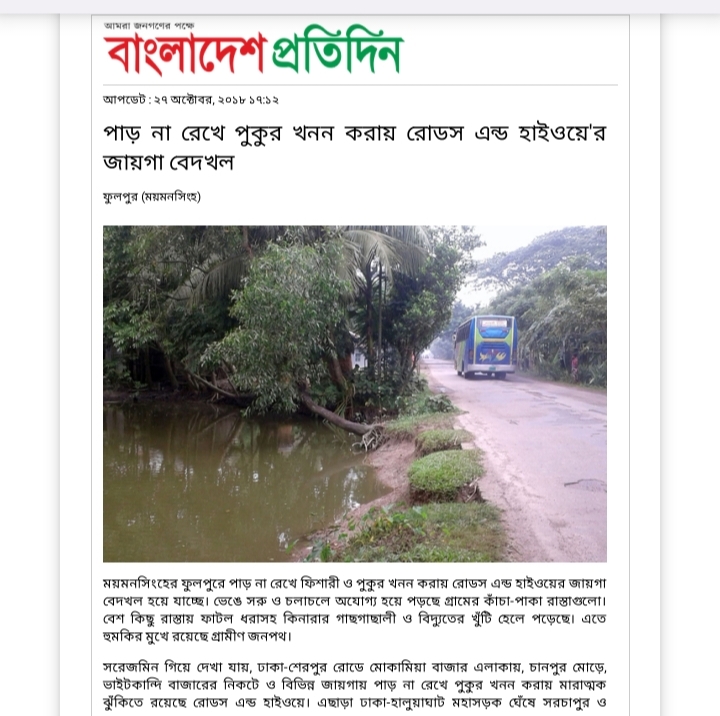 এজন্য ময়মনসিংহের ফুলপুর উপজেলার সাবেক ইউএনও বর্তমানে নরসিংদী জেলা প্রশাসক মোহাম্মদ রাশেদ হোসেন চৌধুরীর উপস্থিতিতে বক্তব্যে ও নিউজে এ দাবিটি উত্থাপন করে আসছিলাম। পরবর্তীতে বাংলাদেশ প্রতিদিনে ২০১৮ সনের ২৭ অক্টোবর ‘পাড় না রেখে পুকুর খনন করায় রোডস্ এন্ড হাইওয়ের জায়গা বেদখল’ শিরোনামে