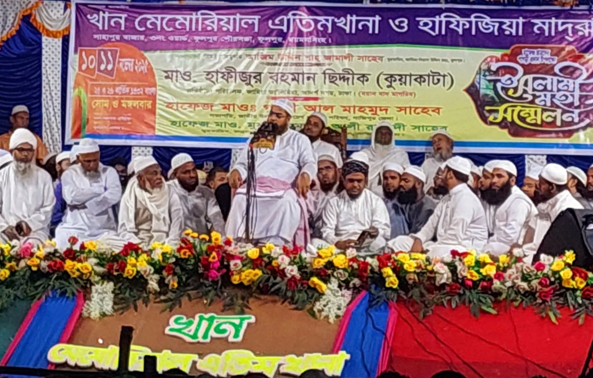এসময় খান মেমোরিয়াল এতিমখানা ও হাফিজিয়া মাদরাসার মুহতামিম হাফেজ মাওলানা মাহমুদুর রহমান মানিকের সঞ্চালনায় মঞ্চে উপবিষ্ট ছিলেন, সভার সভাপতি পীরে কামেল মুফতী আজীমুদ্দীন শাহ জামালী, ময়মনসিংহ-২ আসনে বিএনপি মনোনীত এমপি পদপ্রার্থী মোতাহার হোসেন তালুকদার, ফুলপুর উপজেলা বিএনপির আহ্বায়ক আলহাজ্ব সিদ্দিকুর রহমান, মাদরাসার প্রতিষ্ঠাতা ডা. এ কে এম শামীম খান, উনার আব্বা, হাফেজ মাওলানা ইয়াহইয়া, মাওলানা আওলাদ হুসাইন, মাওলানা এ কে এম জালাল উদ্দিন, জাতীয় উলামা মাশায়েখ আইম্মা পরিষদ, গাজীপুর জেলা শাখার সভাপতি হাফেজ মাওলানা গাজী আল মাহমুদ, হাফেজ মাওলানা ইবরাহীম খলিল, হাফেজ মাওলানা আব্দুল্লাহ আল ফাহাদ, মাওলানা কেফায়েতুল্লাহ, মুফতী ইখলাস উদ্দিন, মাওলানা মো. আব্দুল মান্নান প্রমুখ।