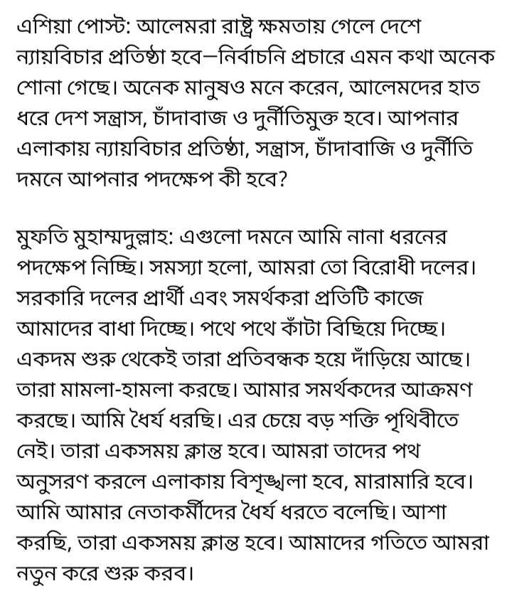 উল্লেখ্য, সম্প্রতি ‘এশিয়া পোস্ট’ নামে একটি পত্রিকা এমপি মুহাম্মাদুল্লাহর একটি সাক্ষাৎকার প্রচার করে। ওই সাক্ষাৎকারটি ফুলতারা নামে একটি অনলাইন পত্রিকা শেয়ার করে। সেখান থেকে জানতে পেরে বিএনপি নেতা মোতাহার হোসেন তালুকদার এ সংবাদ সম্মেলন করেন। এশিয়া পোস্ট এমপি মুহাম্মাদুল্লাহর নিকট জানতে চায়, ‘আপনার এলাকায় ন্যায় বিচার প্রতিষ্ঠা, সন্ত্রাস, চাঁদাবাজি ও দুর্নীতি দমনে আপনার পদক্ষেপ কি হবে? ওই প্রশ্নের উত্তরে এমপি মুহাম্মাদুল্লাহ বলেন, এগুলো দমনে আমি নানা ধরনের পদক্ষেপ নিচ্ছি। সমস্যা হলো- আমরা তো বিরোধী দলের। সরকারি দলের প্রার্থী এবং সমর্থকরা প্রতিটি কাজে আমাদের বাধা দিচ্ছে। পথে পথে কাঁটা বিছিয়ে দিচ্ছে। একদম শুরু থেকেই তারা প্রতিবন্ধক হিসেবে দাঁড়িয়ে আছে। তারা মামলা হামলা করছে। আমার সমর্থকদের আক্রমণ করছে। আমি ধৈর্য্য ধরছি। এর চেয়ে বড় শক্তি পৃথিবীতে নেই। তারা এক সময় ক্লান্ত হবে। আমরা তাদের পথ অনুসরণ করলে এলাকায় বিশৃঙ্খলা হবে। মারামারি হবে। আমি আমার নেতাকর্মীদের ধৈর্য্য ধরতে বলেছি। আশা করছি- তারা এক সময় ক্লান্ত হবে। আমাদের গতিতে আমরা নতুন করে শুরু করব।