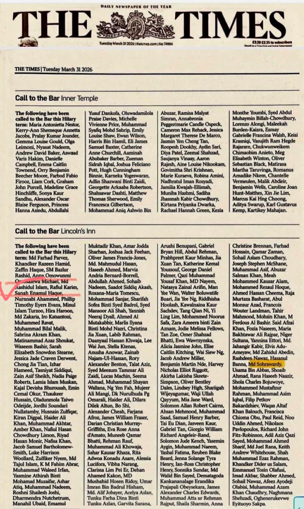 “আলহামদুলিল্লাহ। সুম্মা আলহামদুলিল্লাহ। আল্লাহর অশেষ রহমতে ব্যারিস্টার হিসেবে Lincoln’s Inn Bar-এ Call প্রাপ্তির এই গৌরবময় অর্জন যুক্তরাজ্যের (UK) অন্যতম জনপ্রিয় ও সম্মানিত দৈনিক পত্রিকা The Times-এ পৃথিবীর সকল ব্যারিস্টারদের সাথে আমার নাম Md Rashidul Islam প্রকাশ করেছে।