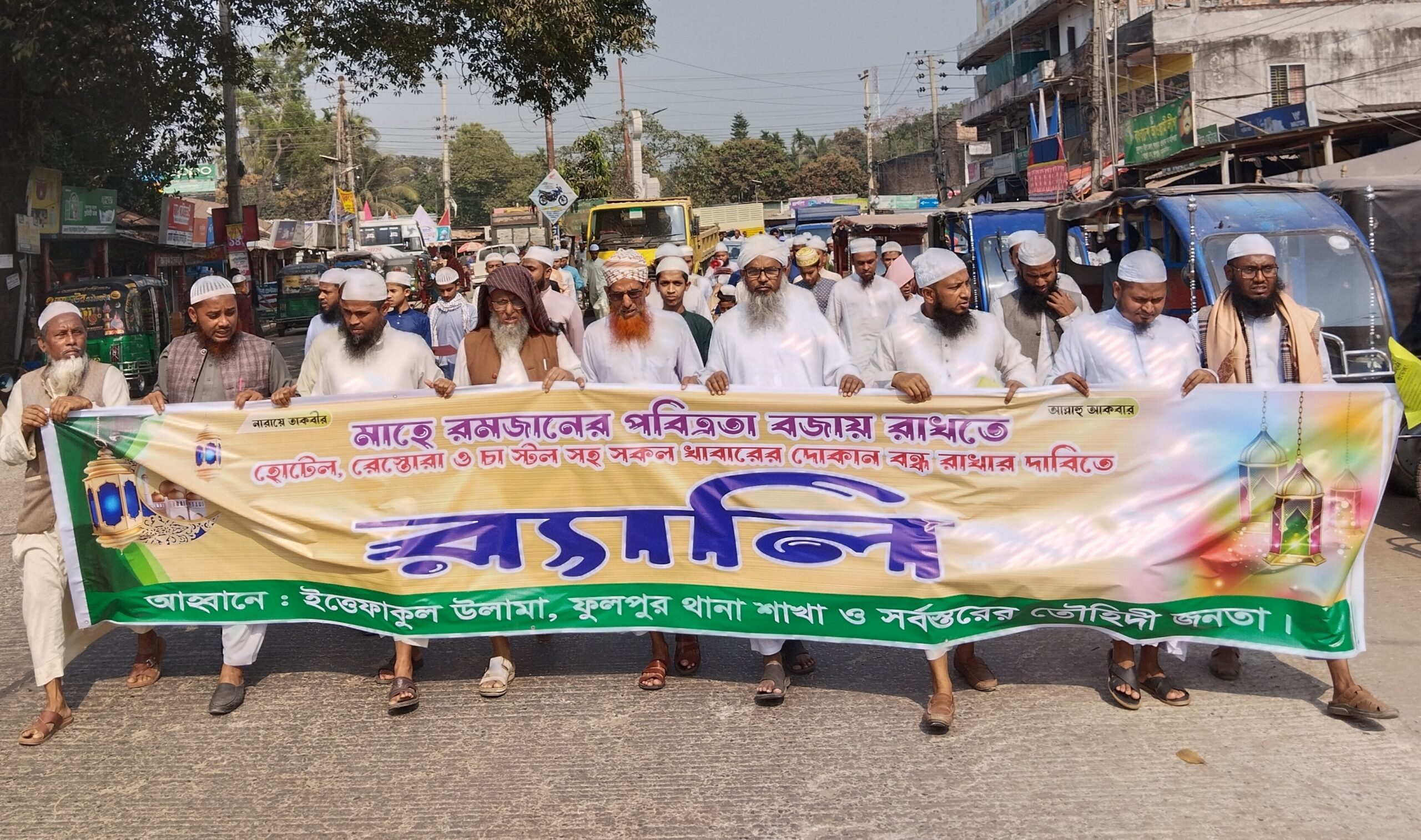 ময়মনসিংহের ফুলপুরে হোটেল রেস্তোরাঁ ও চা স্টলসহ খাবারের সকল দোকানপাট বন্ধ রেখে রমজানের পবিত্রতা বজায় রাখার দাবিতে এক বিশাল র্যালি অনুষ্ঠিত হয়েছে। আজ মঙ্গলবার (১২ মার্চ) যুহরের নামাজের পর ইত্তেফাকুল উলামা ও ইমাম পরিষদ, ফুলপুর শাখার উদ্যোগে ওই র্যালি অনুষ্ঠিত হয়। র্যালিটি ফুলপুর বাসস্ট্যান্ড জামে মসজিদ থেকে শুরু হয়ে উপজেলা পরিষদের গেট পর্যন্ত যায়। সেখান থেকে ফিরে আমুয়াকান্দা ব্রিজ পার হয়ে হাসপাতালের নিকট থেকে পুনরায় বাসস্ট্যান্ডে যাত্রী ছাউনির সামনে এসে এক পথসভায় মিলিত হয়। এতে নেতৃত্ব দেন, শায়খে বালিয়ার খলিফা মুফতি আজীমুদ্দীন শাহ জামালী ও ফুলপুর ইমাম পরিষদের সভাপতি হাফেজ মাওলানা মুহিউদ্দিন। সভায় ইত্তেফাক নেতা মাওলানা মাহমুদুর রহমান মানিকের সঞ্চালনায় বক্তব্য রাখেন, ফুলপুর ইমাম পরিষদের সভাপতি মাওলানা মুহিউদ্দিন, ইত্তেফাকুল উলামা নড়াইল ইউনিয়ন শাখার সভাপতি মাওলানা আব্দুল মান্নান প্রমুখ। বক্তারা বলেন, মাহে রমজানের পবিত্রতা রক্ষা করা আমাদের ঈমানী দায়িত্ব। রমজানের পবিত্রতা রক্ষা করুন। নিজে তাকওয়া অর্জন করুন এবং সমাজে তাকওয়া অর্জনের পরিবেশ তৈরিতে অবদান রাখুন। রমজানের পবিত্র বজায় রাখতে দিনের বেলায় হোটেল রেস্তোরাঁ ও চা স্টলসহ সকল খাবারের দোকান বন্ধ রাখুন। নিত্য প্রয়োজনীয় দ্রব্য সামগ্রীর দাম জনসাধারণের ক্রয় ক্ষমতার মধ্যে রাখুন। কুরআন পড়ুন, কুরআন বুঝুন ও আল কুরআনের সমাজ গড়ুন। সুদ, ঘুষ, মদ, জুয়া অশ্লীলতা বেহায়াপনাসহ সকল প্রকার হারাম কার্যক্রম থেকে নিজে বিরত থাকুন ও অধিনস্তদের বিরত রাখুন। সিনেমা হল, টেলিভিশন, সোশ্যাল মিডিয়াসহ ফেসবুক, ইউটিউব প্রভৃতি বিনোদন মাধ্যমে সকল প্রকার অশ্লীলতা বন্ধ করুন। আল্লাহকে ভয় করুন। আল্লাহর উপর ভরসা রাখুন। অসহায় ও দরিদ্রদের পাশে দাঁড়ান।