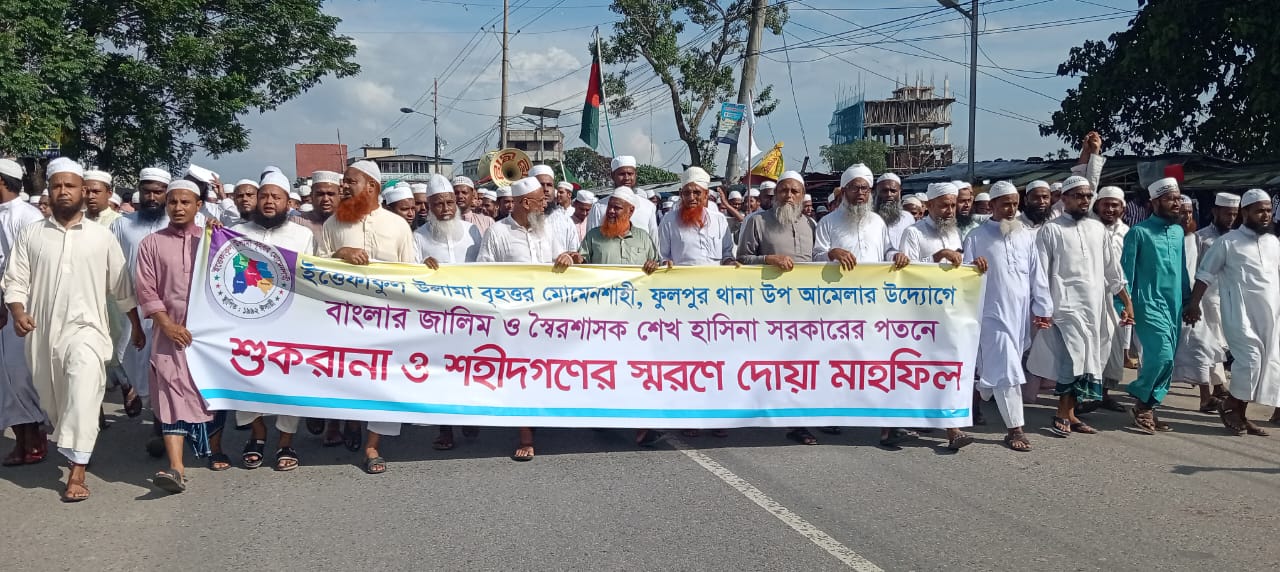 হাসিনা সরকারের পতনে ফুলপুরে উলামায়ে কেরামের শোকরানা মিছিল ও শহীদদের জন্য দোয়া মাহফিল