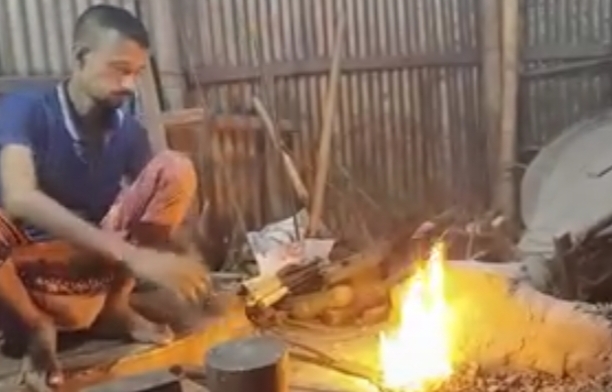 ছবিতে যে ছেলেটিকে দেখা যাচ্ছে, আগুনে লোহা পুড়িয়ে, হাতুড়ির ঘা মেরে দা বানাতে- সে একজন বি.এ.।