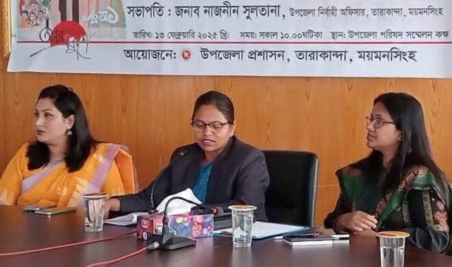 এতে সভাপতিত্ব করেন তারাকান্দা উপজেলা নির্বাহী অফিসার (ইউএনও) নাজনীন সুলতানা। সভায় বক্তব্য রাখেন, সহকারী কমিশনার (ভূমি) সৈয়দা তামান্না হুরায়রা, উপজেলা কৃষি কর্মকর্তা কৃষিবিদ অরুনিমা কাঞ্চি সুপ্রভাত শাওন প্রমুখ। এসময় উপজেলার বিভিন্ন দপ্তরের কর্মকর্তা, বৈষম্য বিরোধী ছাত্র আন্দোলনের নেতৃবৃন্দ, সাংবাদিক, সুধী মহল ও সুশীল সমাজের প্রতিনিধিরা উপস্থিত ছিলেন।